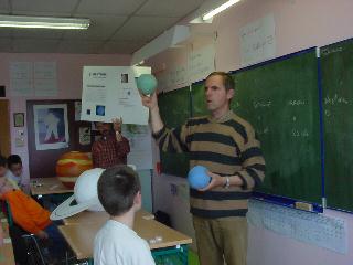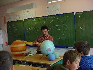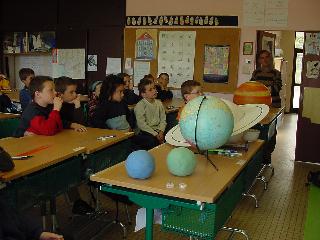 Ils nous ont aussi parlé des autres planètes du système solaire, qu'ils nous ont montrées avec une maquette. Ils ont reproduit les petites planètes avec des billes, et les grosses avec des globes en polystyrène ou en plastique. Il faudrait une boule de 4 mètres de diamètre pour que le Soleil soit à la même échelle que les autres planètes.